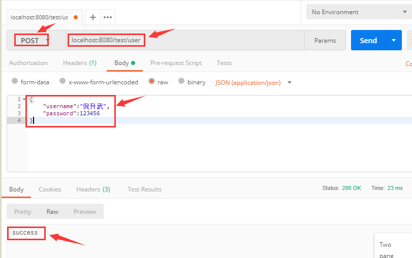 我们使用 postman 工具来测试一下效果,打开 postman,然后输入请求地址和参数,参数我们用 json 来模拟,如下图所有,调用之后返回 success。